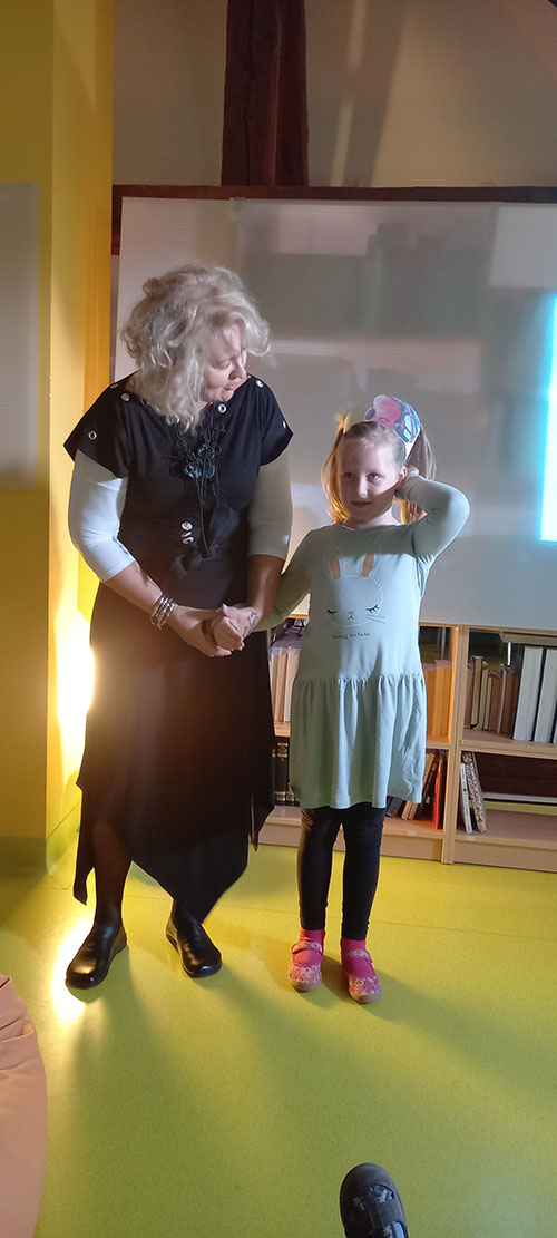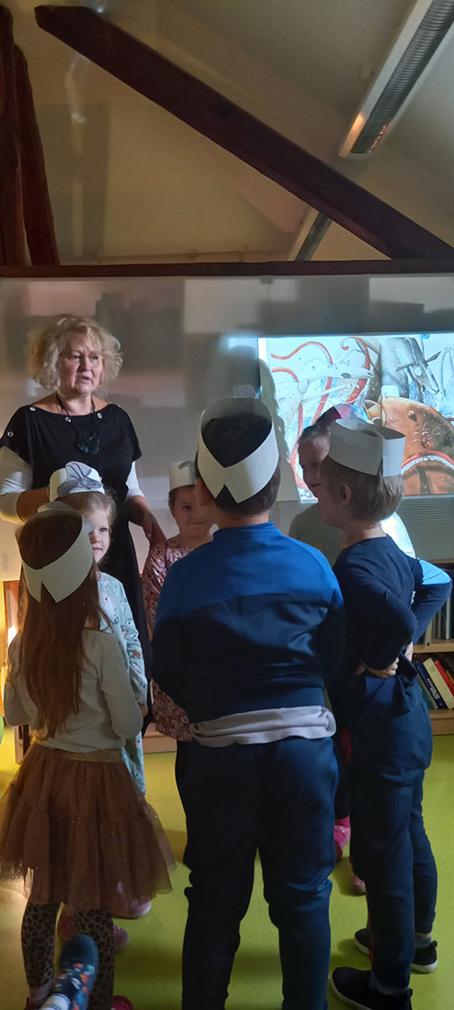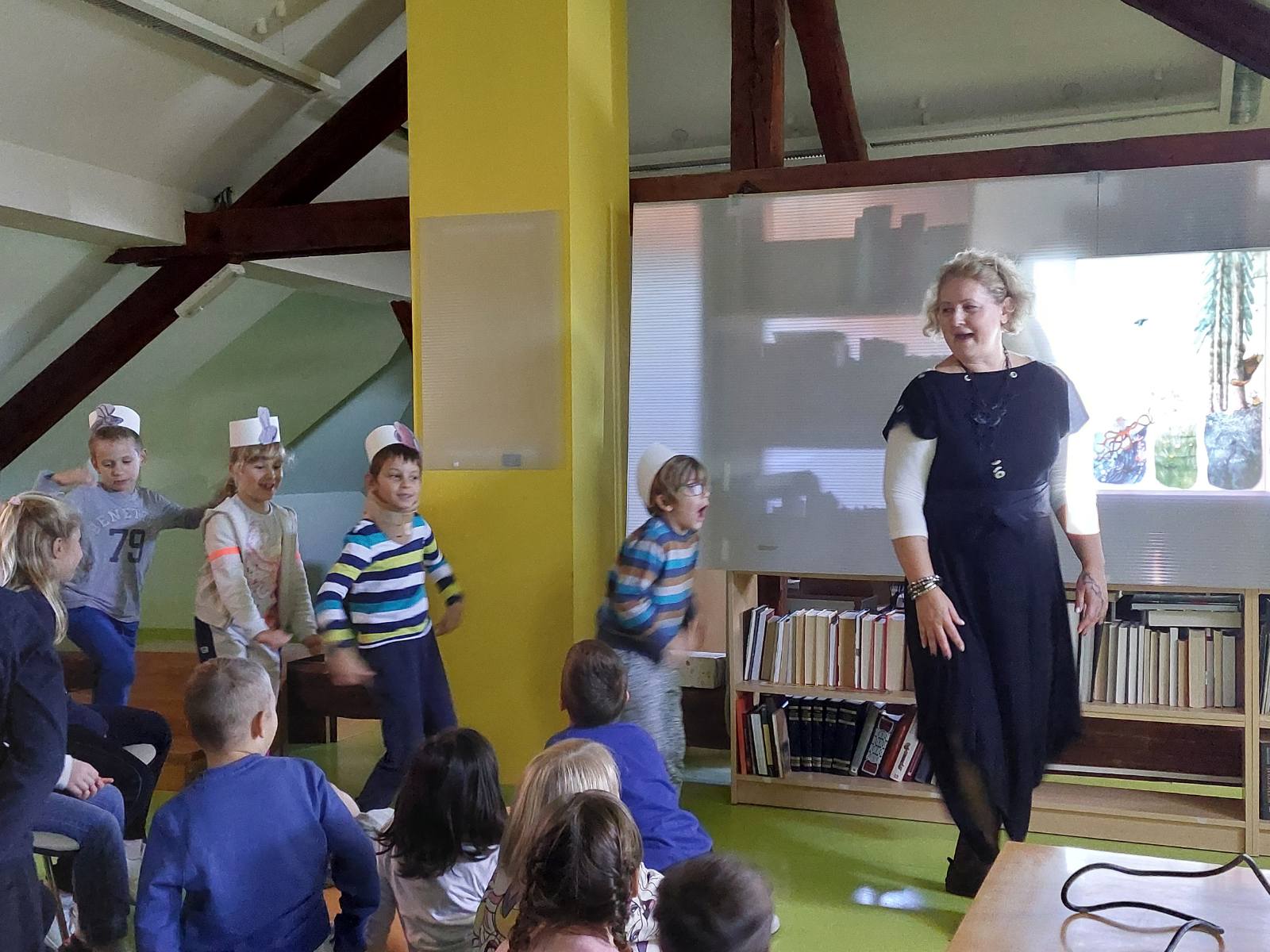Boravak u knjižnici započeo je veselim predstavljanjem posjetitelja i domaćina, kratkim upoznavanjem s prostorom knjižnice i pravilima ponašanja a potom smo nastavili druženje u potkrovlju koristeći multimedijalni prostor. Tu nas je dočekala slikovnica i njeni likovi.